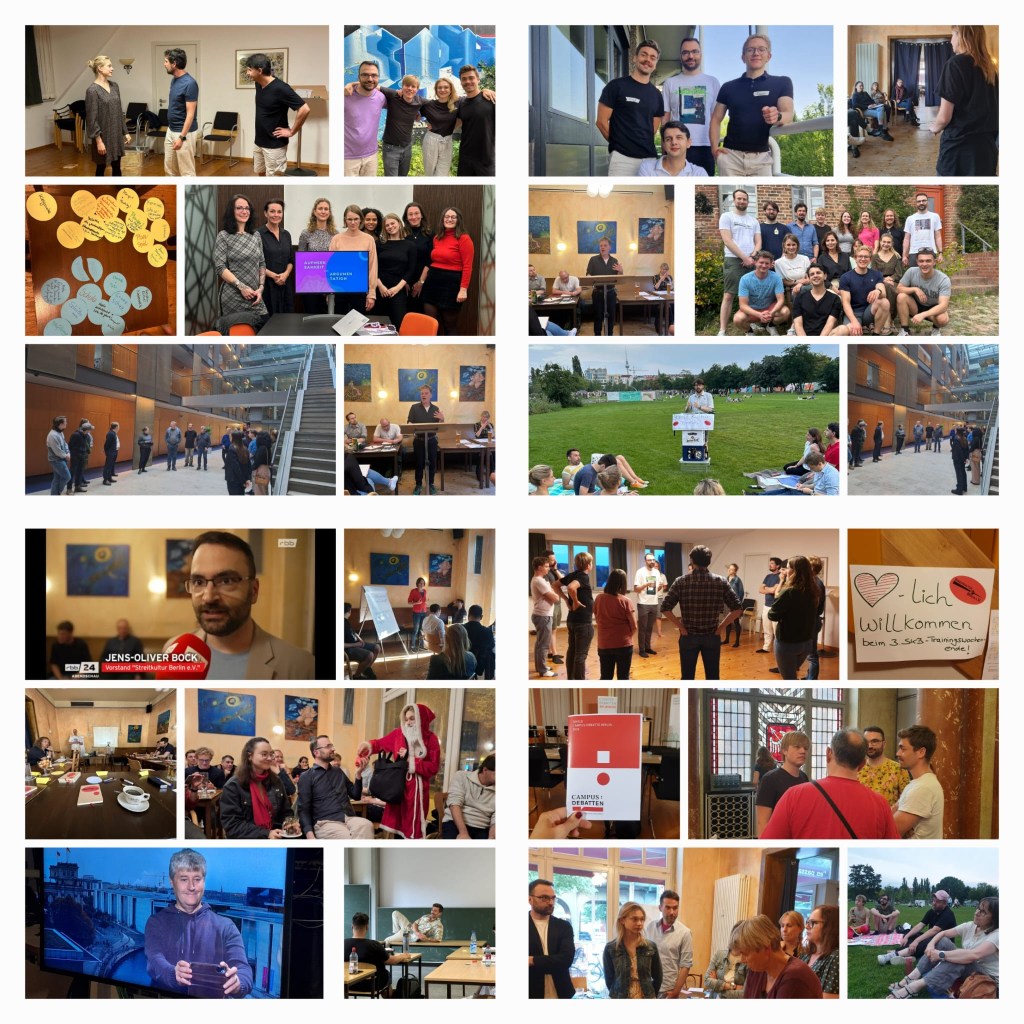 Argumentationslogik-Training, Biesenthal-Trainingswochende, Christklindlmarkt-Besuch, Debatten, Debatten, Debatten, Einführungabende, Frauentraining, Gutenberg-Cup mit Markus als Finalist, Heißer Stuhl beim Zirkeltraining in Biesenthal, Intensivtrainingsnachmittag, Jugendlichen beim Schulbesuch im Ernst-Abbe-Gymnasium das Debattieren vermitteln, Kooperationsanfragen, Logo-Neugestaltung, Medienberichterstattung durch den rbb, Neumitglieder begrüßen, Outdoor-Debatte, Picknick beim Wandertag, Rentier-Debatte bei der Weihnachtsfeier, Showdebatte zu religiösen Feiertagen, Tunierteilnahmen, Überraschungs-Debattenabende, Vereins-Sommerfest, Wir für die Demokratie-Workshop, X bespielen wir nicht mehr aktiv, dafür Instagram ;-), Gen Y-Vertreter:innen im Verein begrüßen bis Zusammen das ARD-Haupstadtstudio besuchen – es war viel los in diesem Jahr. Wir danken euch von Herzen für euer Interesse und eure Teilnahme an und eure Unterstützung von Veranstaltungen.