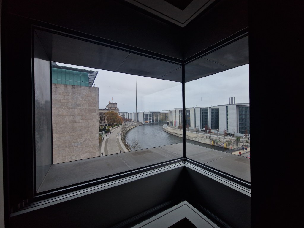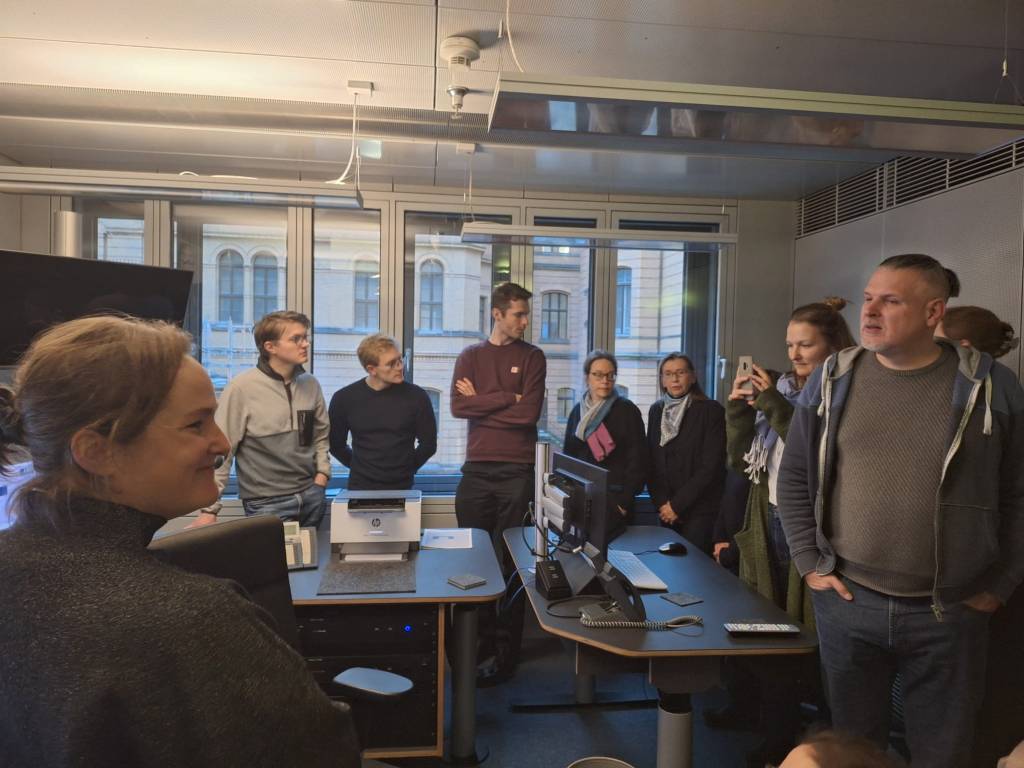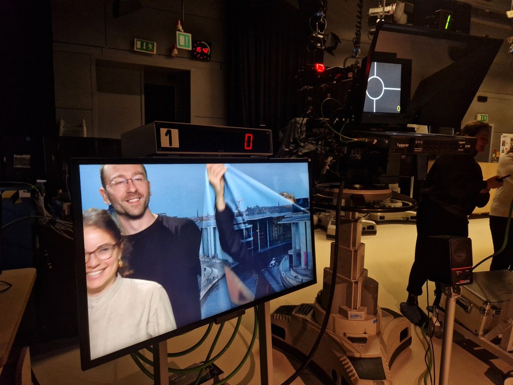 In einer etwa 60-minütigen Führung ging es für die rund 20 Teilnehmerinnen und Teilnehmer weiter in die oberste Etage des Gebäudes, die durch ihre gläserne Fassade an der oberen Ecke schon von außen ins Auge fällt. Im dortigen Fernsehstudio wurde der Greenscreen getestet – eine spannende Möglichkeit, sich einmal selbst in die Rolle eines Moderators zu versetzen. Die Teilnehmerinnen und Teilnehmer hatten sichtlich Spaß daran, vor der Kamera zu stehen, und nutzten die Gelegenheit, ein paar Erinnerungsfotos zu machen. Für Heiterkeit sorgte auch, dass ein Volontär zu uns stieß, nachdem es uns auf dem Hauskanal bei unseren Spielereien mit grüner Decke gesehen hatte – dass wir live (Im ganzen Haus!) übertragen werden, wurde uns zuvor nicht gesagt. Nach informativen Einblicken und vielen neuen Eindrücken endete die kurzweilige Führung. Wenn wir Politiker oder andere Persönlichkeiten im Studio des ARD-Hauptstadtstudios jetzt interviewt sehen, wissen wir genau, wo diese Gespräche stattfinden – und wie viel Arbeit dahintersteckt. Möchtest du nächstes Mal auch dabei sein? Dann melde dich hier für unseren Newsletter an und verpasse keine weiteren spannenden Ausflüge und Debatten!